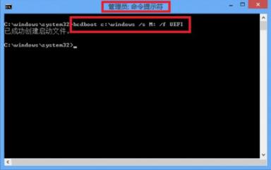 3、用管理员身份打开命令提示符,并输入bcdboot c:\windows /s X: /f UEFI