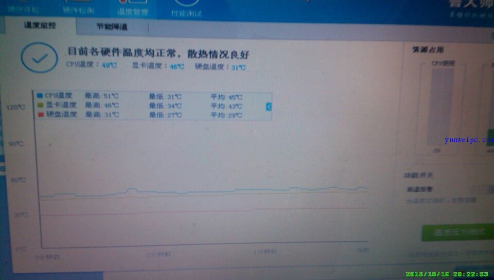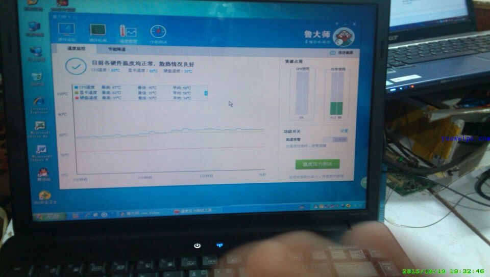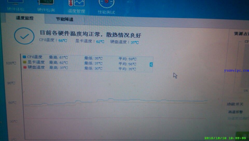 鲁大师检测温度Cpu66度 显卡62度 硬盘37度。客户反映这