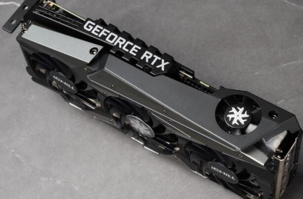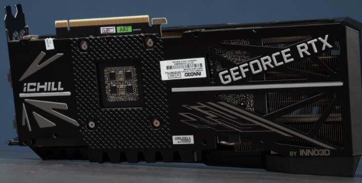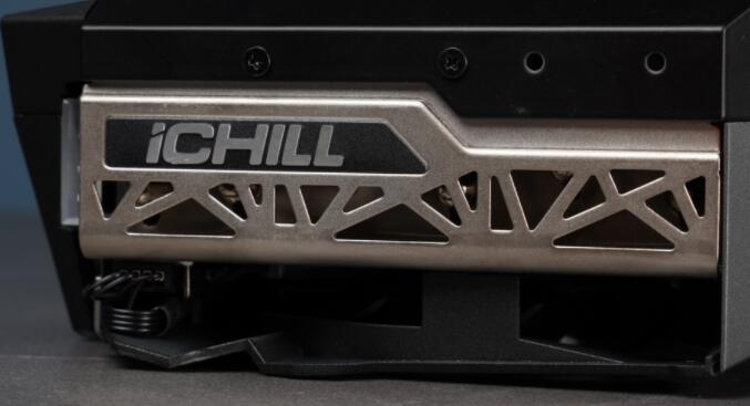 接下来看到显卡的上边,最右边的小风扇旁边是透光板(有上全黑的半透明漆,因此在未点亮仍可看到若隐若现的电路纹与ICHILL字样,再来是印有GeForce RTX字样的金属挡板,这块可以拆卸,拆掉后PCIe从3槽变成2槽。