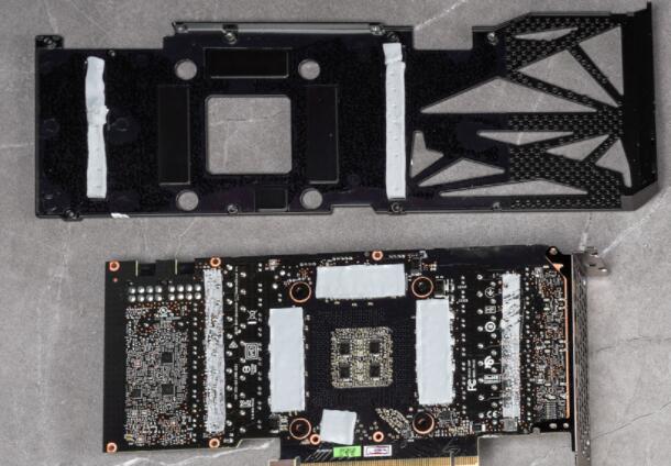 最后来看到显卡背板,在金属背板的前端有跟芯片周围有一样的圆形凸起设计,在PCB板背部对应显卡內存跟MOSFET背部不但有导热贴片加强外,在金属背板也有凸起增加散热面积。