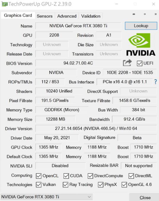 GPU-Z显示显卡详细规格,虽然截至文章上传仍无法判图核心内容,但已有着10240个CUD A核心,以及12288 MB GDDR6X的美光內存,以及基础时脉为1365 MHz、Boost时脉为1710 MHz等数据可供显示。