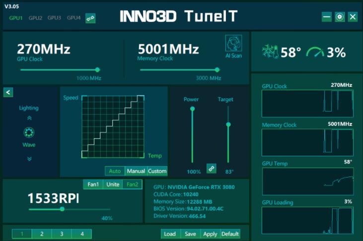 Inno3D也有提供旗下显卡产品Inno3D TuneIT OC & RGB Utility软件,让玩家设定超频频率、风扇转速跟RGB显示等。可以看到显卡在软件虽然为RTX 3080,但已经可以辨别出正确的CUDA核心数与內存数量。