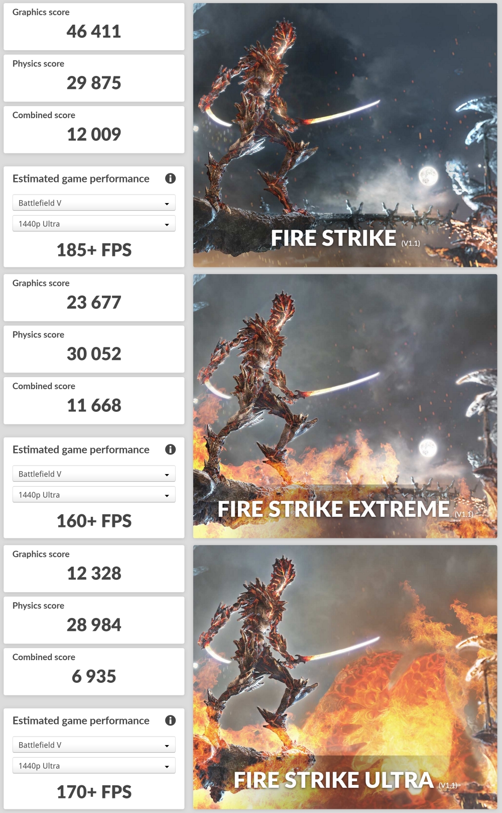 3DMark Fire Strike测试,是模拟基于DirectX 11 API的游戏,将电脑在运行AAA游戏时的表现以分数化来评断。而3DMark Fire Strike、Extreme与Ultra分别在1080P、2K与4K分辨率下运行。Inno3D RTX 3080 Ti ICHILL X4 12GB GDDR6X在Graphics score上分别获得46411、23677与12328分。