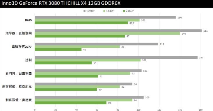 实际游戏测试部分,这边都采用相对吃性能的AAA大作游戏,包含《控制》、《电驭叛客2077》、《刺客教条:奥德赛》、《刺客教条:维京纪元》、《地平线:期待黎明》、《Dirt 5》与《看门狗:自由军团》7款游戏,并设定在1080P、1440P跟2160P三种分辨率、预设画质最高的选项。