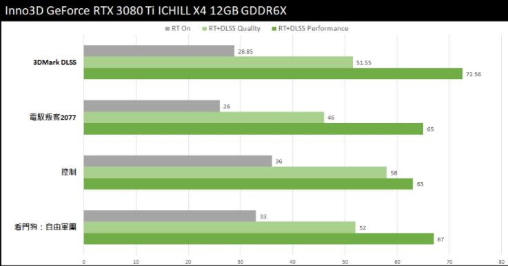 光追游戏测试部分,这边选择在4K分辨率下,挑选《控制》、《电驭叛客2077》、《看门狗:自由军团》3款游戏与3DMark DLSS功能测试做为参考基准。而在DLSS的部分,则分别选择Performance性能与Quality质量两种模式开启。(《控制》这边并没有模式选择,而是调整渲染分辨率,详细内容请看图表。)
