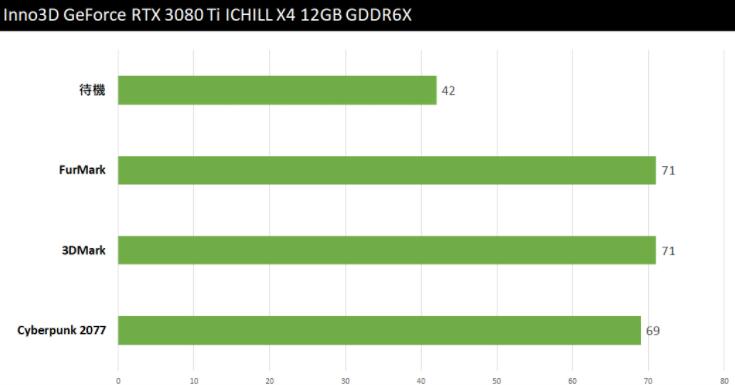 Inno3D GeForce RTX 3080 Ti ICHILL X4 12GB GDDR6X待机时GPU待机温度在42°C,而在Time Spy Stress test压力测试跟FurMark高负载测试下可以达到71°C,不过游戏时温度有较低,控制在69°C。