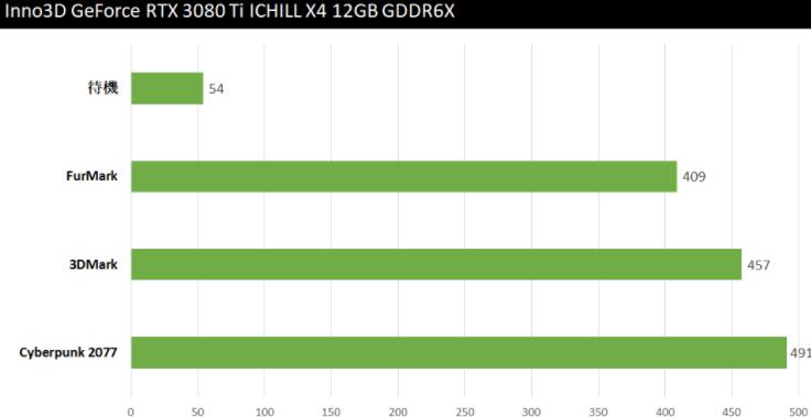 Inno3D GeForce RTX 3080 Ti ICHILL X4 12GB GDDR6X待机时GPU待机功耗在54瓦,而在FurMark高负载测试下可以达到409瓦、Time Spy Stress test压力测试次高,在457瓦。而在《电驭叛客2077》达到最高,推测是在491瓦。