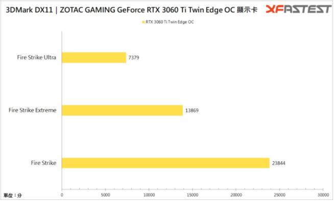 3DMark为模拟3A级游戏绘图运算的性能测试软件,其中Fire Strike系列是模拟DX11游戏运行的情况,在FHD分辨率的Fire Strike测试中,RTX 3060 Ti Twin Edge OC的分数获得了23,844分;2K分辨率的Fire Strike Extreme测试中,获得了13,869分;4K分辨率的Fire Strike Ultra测试中,获得了7,379分。