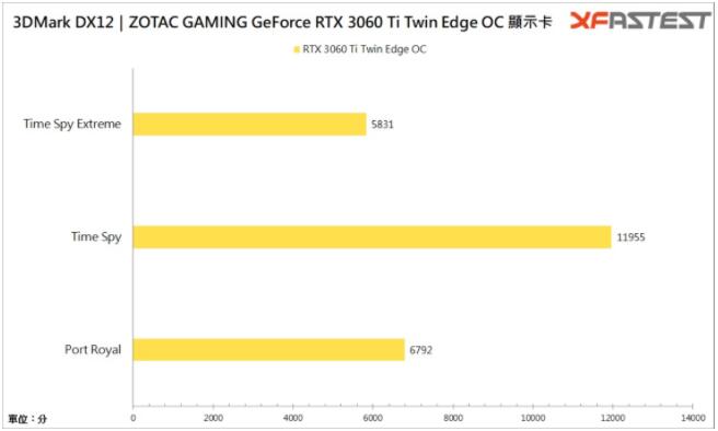 DX12 API测试一样使用3DMark进行,Port Royal为加入光线追踪技术的游戏模拟测试,预设测试分辨率为2K,RTX 3060 Ti Twin Edge OC通过测试并获得6,792分;Time Spy系列则主要是测试DX12下的游戏表现,Time Spy预设分辨率为2K,获得11,955分,而4K画质的Extreme测试,获得5,831分。
