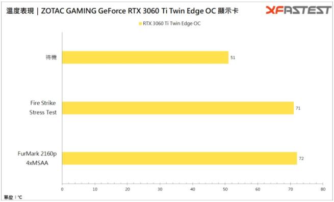 温度与功耗测试以整平台最高数值为主,搭配的是i9-10900k处理器,透过FurMark、Fire Strike Stress Test、GPU-Z,模拟高负载、游戏及待机等情况下的温度及功耗。RTX 3060 Ti Twin Edge OC待机时由于有风扇低温停转设定,温度约为50度上下,功耗部分则是53 W;Fire Strike Stress Test运行时的温度则为71度,功耗279 W;FurMark 4xMSAA运行时的温度则为72度,功耗262 W。整体在烧机下温度表现还算不差,虽然整张卡的尺寸小了点,但仅70度左右的温度确实让人有些惊艳。