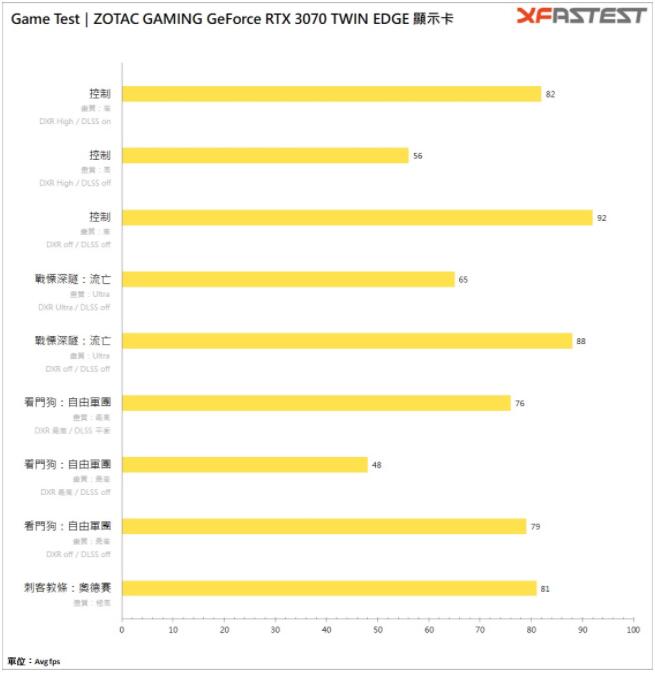 在游戏测试部分,采用数款不同性质的游戏进行测试,并以1080p分辨率进行测试。游戏部分主要针对具备光追的3A大作进行测试,包含《控制》、《战栗深邃:流亡》及《看门狗:自由军团》,而一般3A大作选择较吃资源《刺客教条:奥德赛》进行测试。