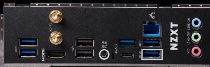 主板后I/O部分有一体式后挡板,则提供2个天线插孔、一个BIOS FLBK按钮、2个USB 2.0 Gen1、4个USB 3.2 Gen2以及1个USB 3.2 Gen1以及TYPE-C、RJ-45、HDMI 2.1、Wi-Fi天线与3.5mm音效输出。