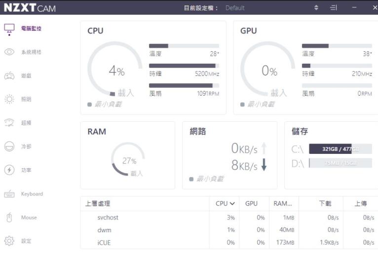 刚刚有提到N5 Z690有2个很特别的NZXT RGB插槽,这些都可以从CAM软件直接改灯效或是转速,除了这些也可以直接监控CPU、GPU温度、RAM、网速以及C槽D槽的容量。