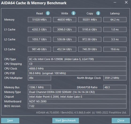 AIDA64內存与缓存测试,內存使用G.SKILL Trident Z DDR4 8GB*2,搭配N5 Z690有着內存读取51028 MB/s、写入46830 MB/s、复制50201 MB/s、延迟64.2 ns的表现。
