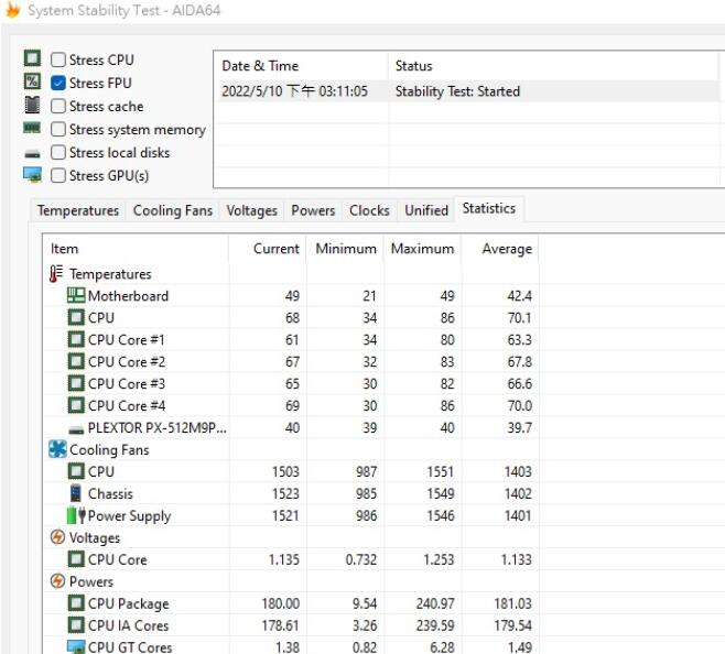 配搭NZXT X42 360 AIO水冷,经过5分钟的AIDA64 FPU烧机测试,i9-12900K CPU Package最高温度为86℃,CPU Package功耗大约是180 W,并且维持全核4.5 GHz。