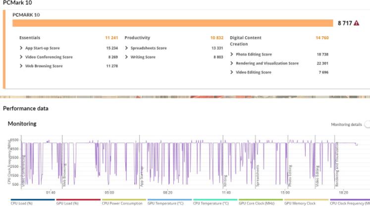 PCMark 10测试整机性能,能针对Essentials基本电脑工作、Productivity生产力、Digital Content Creation图像内容创作,三大方面来判断电脑性能i9-12900K搭配RTX 3070共获得总分8717分。其中在程序启动、视讯会议等基本电脑工作上获得11241分;在以文书工作为测试的生产力中获得10832分。在较吃性能的图像内容创作上,则获得14760分。