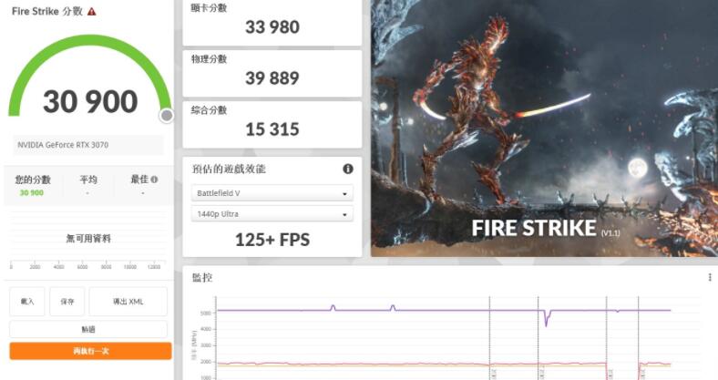 3DMark Fire Strike是基于DirectX 11的游戏测试,将电脑在运行AAA游戏时的表现以分数化来评断。而在1080 P分辨率下运行的Fire Strike,获得总分30900分、而i9-12900K的物理分数与RTX 3070显卡分数则分别获得39889分跟33980分。