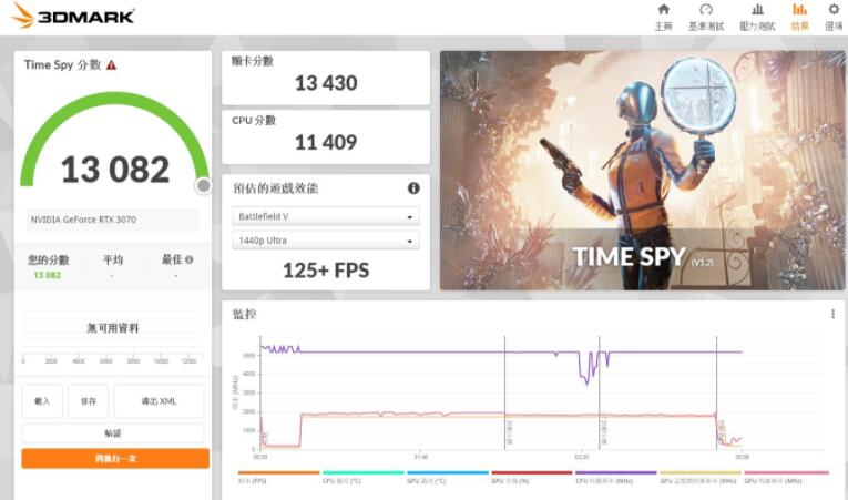 3DMark Time Spy是基于DirectX 12的游戏测试,将电脑在运行AAA游戏时的表现以分数化来评断。而在2K分辨率下运行的Time Spy,获得总分13082分、而i9-12900K的CPU分数与RTX 3070显卡分数则分别获得11409分跟13430分。