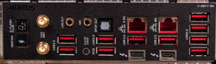 最后USB则包含2个Thunderbolt 4 Type C、1个前置USB 3.2 Gen 2×2 Type C,以及10个USB 3.2 Gen 2、4个USB 3.2 Gen 1与4个USB 2.0的高扩充;给予玩家满满的扩充能力。