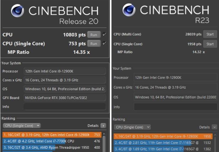i9-12900K在R20版本测试可达到CPU 10803 cb的成绩,而R23版本亦有着CPU 28039 pts的成绩;单核性能则分别有着753 pts、1958 pts的性能。