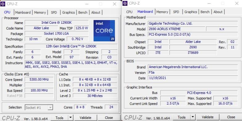 CPU-Z检视Intel Core i9-12900K处理器信息,代号Alder Lake的Intel 7 10nm制程8+8核心24线程处理器,搭配Z690 AORUS XTREME主板测试,BIOS已更新至F5a,內存则是双通道DDR5 32GBx2 5200MHz。