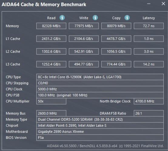 AIDA64內存与缓存测试,內存使用CORSAIR DOMINATOR PLATINUM RGB DDR5 32GBx2 5200MHz,搭配Z690 AORUS XTREME有着內存读取82328 MB/s、写入77975 MB/s、复制80079 MB/s、延迟72.7 ns的表现。