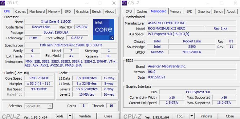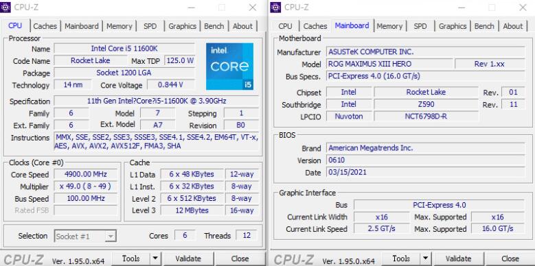CPU-Z检视Intel Core i9-11900K与i5-11600K处理器信息,代号Rocket Lake的14nm制程处理器,这代i9为8核心16线程、i5则是6核心12线程,K系列预设125W TDP热功耗设定,搭配ROG MAXIMUS XIII HERO主板测试,BIOS已更新至0610,內存则是双通道DDR4-3600 8GB*2。
