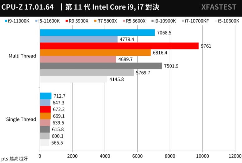 首先CPU-Z的CPU性能测试,多线程测试下i9-11900K获得7068分、i5-11600K获得4779分,相当于对比的5800X与5600X性能,但多核稳输5900X;而这代单线程则是i9-11900K以712.7分夺冠。