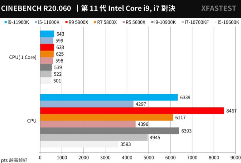 i9-11900K CPU获得6339分的成绩,赢过同核心的5800X,更与10核心的i9-10900K旗鼓相当;i5-11600K则以4297分小输5600X;单核性能一样由i9-11900K夺冠。