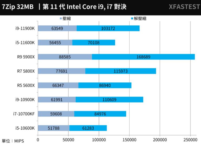另一套7-Zip压缩测试则可有效利用多核心的性能,因此i9-11900K小输i9-10900K。