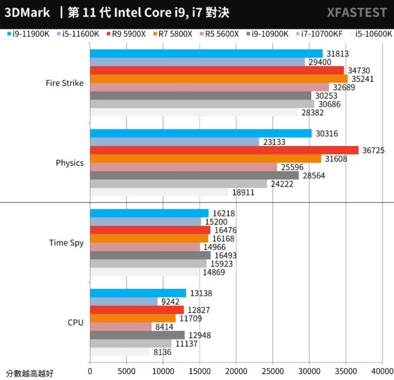 整体性能来看,在DX11的Fire Strike测试上i9-11900K赢过i9-10900K,不过物理性能则是5900X、5800X较高。