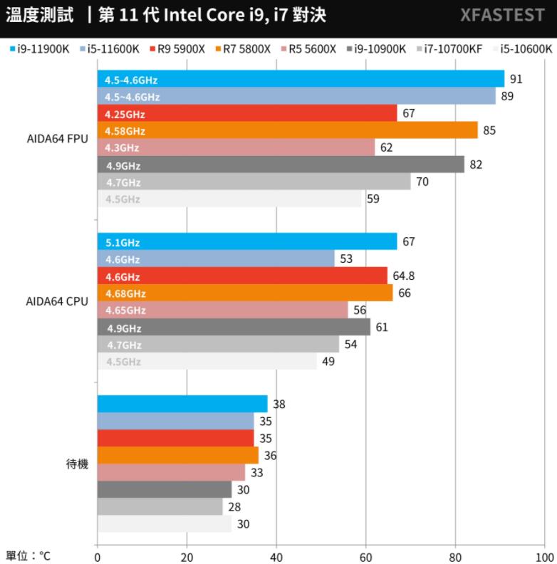 但是当使用AIDA64 FPU压力测试下,i9-11900K则会顶到温度上限发生降频,时脉降低到4.5-4.6GH,且温度居高91°C的临界点,至于i5-11600K一样时脉下也压在89°C的温度;相较AMD大幅降低时脉的温度,以及上一代的温度表现来看,这代温度确实提升不少。