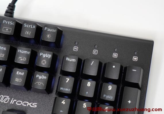 正面右上角由左至右分别是数字锁、大小写、滚动锁、视窗键锁指示灯,四颗LED同时慢闪表示全键锁定,同时快闪则是进入背光自定义,或是字串录制模式。