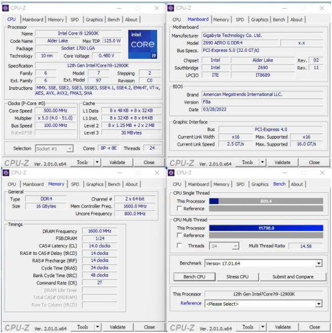CPU-Z检视Intel Core i9-12900K处理器信息,代号Alder Lake的Intel 7 10nm制程8+8核心24线程处理器,搭配GIGABYTE Z690 AERO G DDR4主板测试,BIOS为0418,內存则是双通道DDR5 16GBx2 5200MHz。