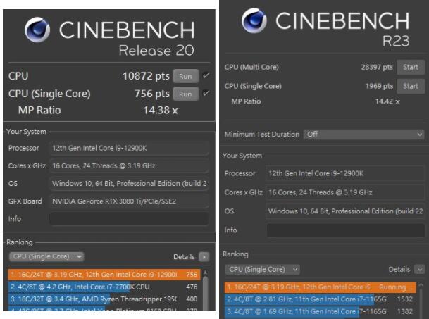 i9-12900K在R20版本测试可达到CPU 10872 cb的成绩,而R23版本亦有着CPU 28397 pts的成绩;单核性能则分别有着756 pts、1969 pts的性能。