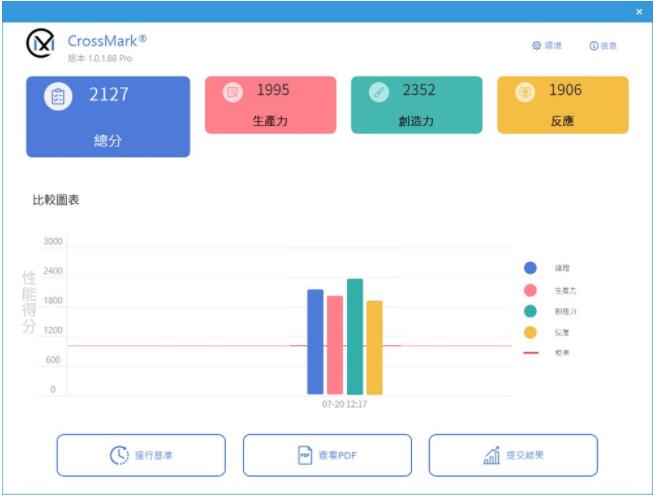 i9-12900K达到2127分的总成绩,生产力1995分、创作力2352分、反应1906分的高效能。