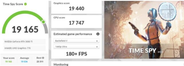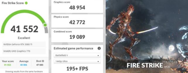 3DMark Fire Strike测试使用RTX 3080 Ti显卡,其CPU物理Physics分数有着42772分;针对DirectX 12所设计的Time Spy测试,CPU获得了17747分的成绩。