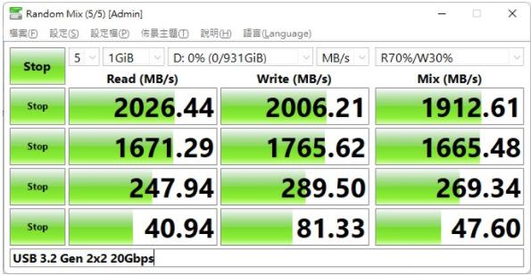 主板的USB 3.2 Gen 2×2 Type C连接埠,使用USB 20Gbps外接盒测试,可以达到循序读写2026 MB/s、2006 MB/s的性能,跑满最高USB传输频宽。
