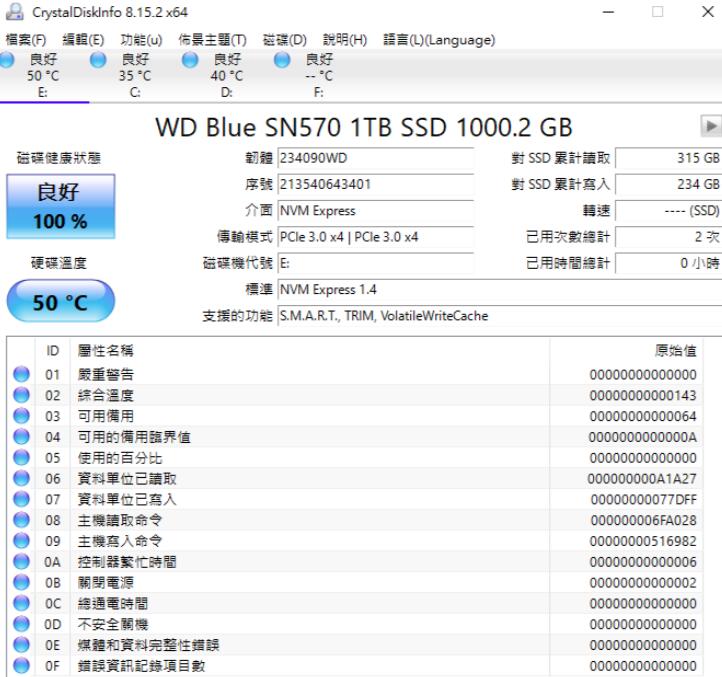 CrystalDiskInfo 8.15.2可以看到SSD的一些信息和状况,NVMe界面,传输模式PCIe 3.0 x4、NVM Express 1.4、S.M.A.R.T、TRIM、VolatileWriteCach。
