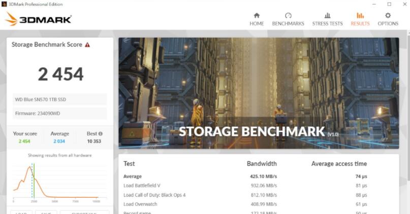 3DMARK Storage Benchmark分数2454,Bandwidth平均频宽约425.10 MB/s,access time平均读取时间74µs。