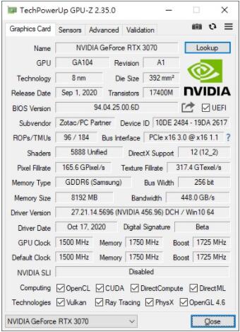 首先可以在GPU-Z中看到显卡的基本信息,ZOTAC GAMING GeForce RTX 3070 TWIN EDGE采用8 nm的GA104核心芯片,并有着5888个Cuda核心,內存则为SAMSUNG GDDR6 256-Bit 8192 MB,在时脉方面,核心时脉为1500 MHz、Boost时脉为1725 MHz、內存时脉为1750 MHz。