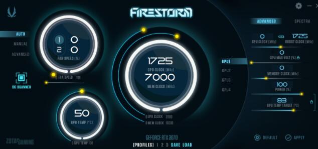 FireStorm软件提供了显卡超频、风扇调整、灯效设定及硬件监控等功能,不过这款Twin EDGE系列没有RGB灯设计,因此软件中的SPECTRA灯效控制功能也无法使用。在超频方面除了手动超频之外,OC Scanner功能可以依据每一张显卡,自动调教出最佳的超频模式,让玩家可以真正使用到显卡最大且稳定的性能。