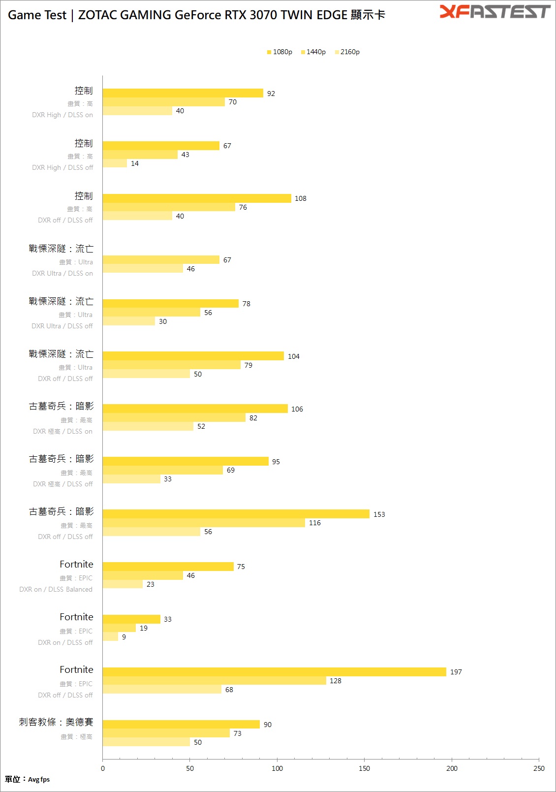 在游戏测试部分,采用数款不同性质的游戏进行测试,并以1080p、1440p及2160p三种分辨率进行测试。游戏部分主要针对具备光追的3A大作进行测试,包含《控制》、《战栗深邃:流亡》、《古墓奇兵:暗影》及《Fortnite》,而一般3A大作选择较吃资源《刺客教条:奥德赛》进行测试。