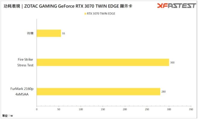 温度与功耗测试以整平台最高数值为主,搭配的是i9-10900k处理器,透过FurMark、Fire Strike Stress Test、GPU-Z,模拟高负载、游戏及待机等情况下的温度及功耗。待机时由于有风扇低温停转设定,温度约为48度上下,功耗部分则是55 W;Fire Strike Stress Test运行时的温度则为70度,功耗300 W;FurMark 4xMSAA运行时的温度则为78度,功耗280 W。