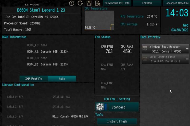 B660M Steel Legend预设开启EZ-Mode,简易模式可以快速了解电脑的基本信息,以及XMP设定、储存装置、FAN设定与开机顺序。在进阶模式中,则可以进OC Tweaker界面调整XMP內存超频。