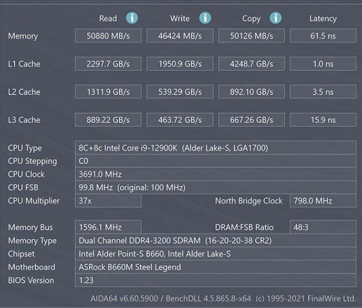 AIDA64內存与缓存测试,內存使用CORSAIR VENGEANCE RGB DDR4 8GBx2 3200MHz,搭配B660M Steel Legend有着50880 MB/s、写入46424 MB/s、复制50126 MB/s、延迟61.5 ns的表现。