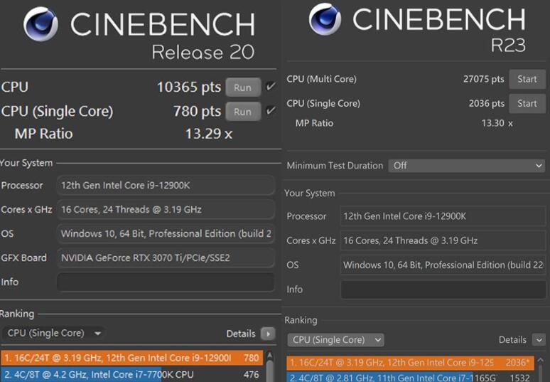 在R20的测试中,i9-12900K获得单核780pts多核10365的成绩;而R23版本上,则获得了单核2036 pts多核27075 pts的成绩。