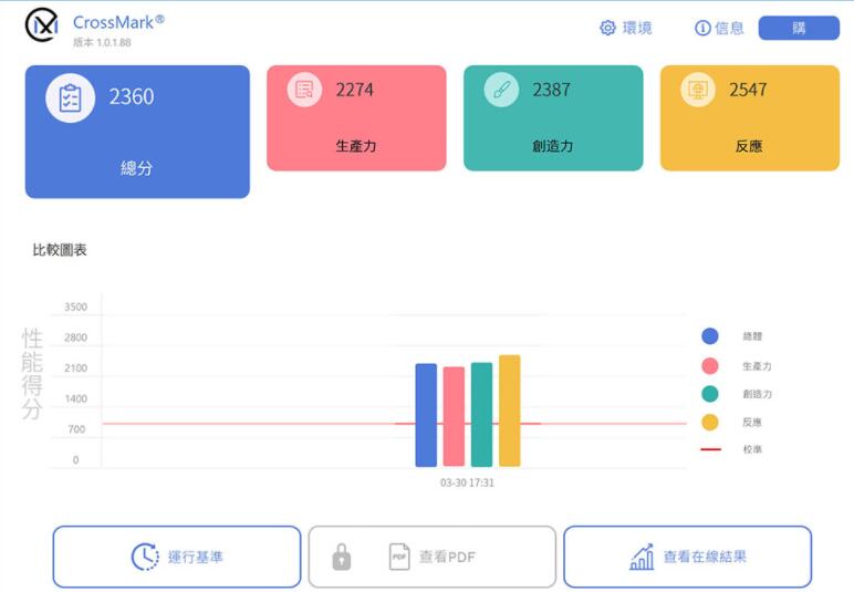CrossMark为跨平台的电脑性能测试软件,Windows版本在Microsoft Store上便可搜寻下载,并支持iOS、macOS与Android等平台。其测试内容分为三大类别,生产力、创造力与反应力,针对电脑的各项实际性能表现来评比。