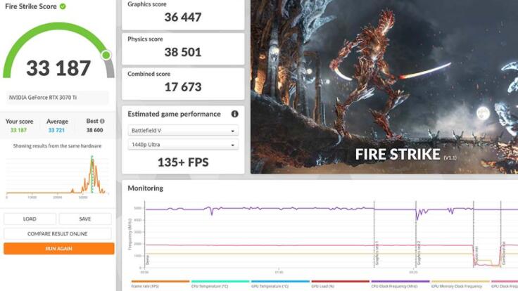 3DMark Fire Strike是基于DirectX 11的游戏测试,将电脑在运行模拟游戏时的表现以分数化来评断。使用RTX 3070 Ti显卡在2K分辨率下测试,其CPU物理Physics获得了38501分,显卡分数则为36447分;总分33187分。