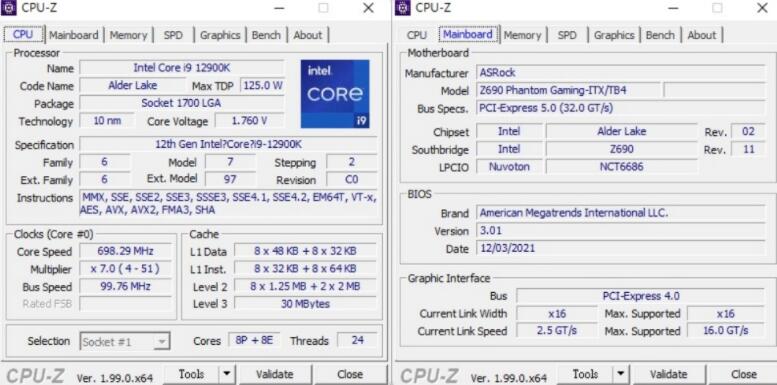 CPU-Z检视处理器的详细信息,Intel Core i9-12900K处理器信息,有着8核心P-CORE跟8核心的E-CORE组合,并总计有16线程与30MB的L3缓存。并有着10奈米制程、LGA 1700脚位、PCIe 5.0等新技术,并已经更新BIOS 3.01版本。